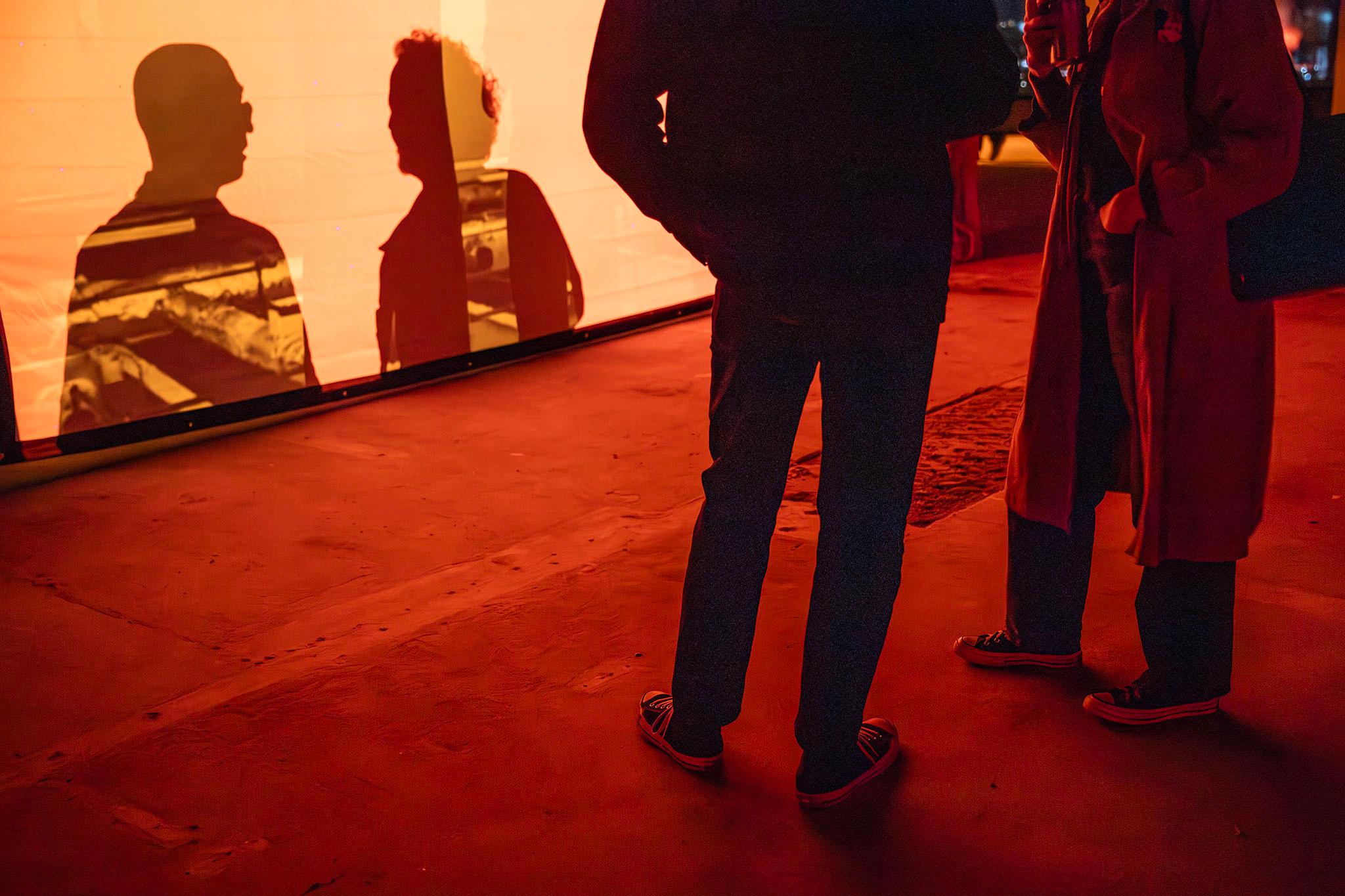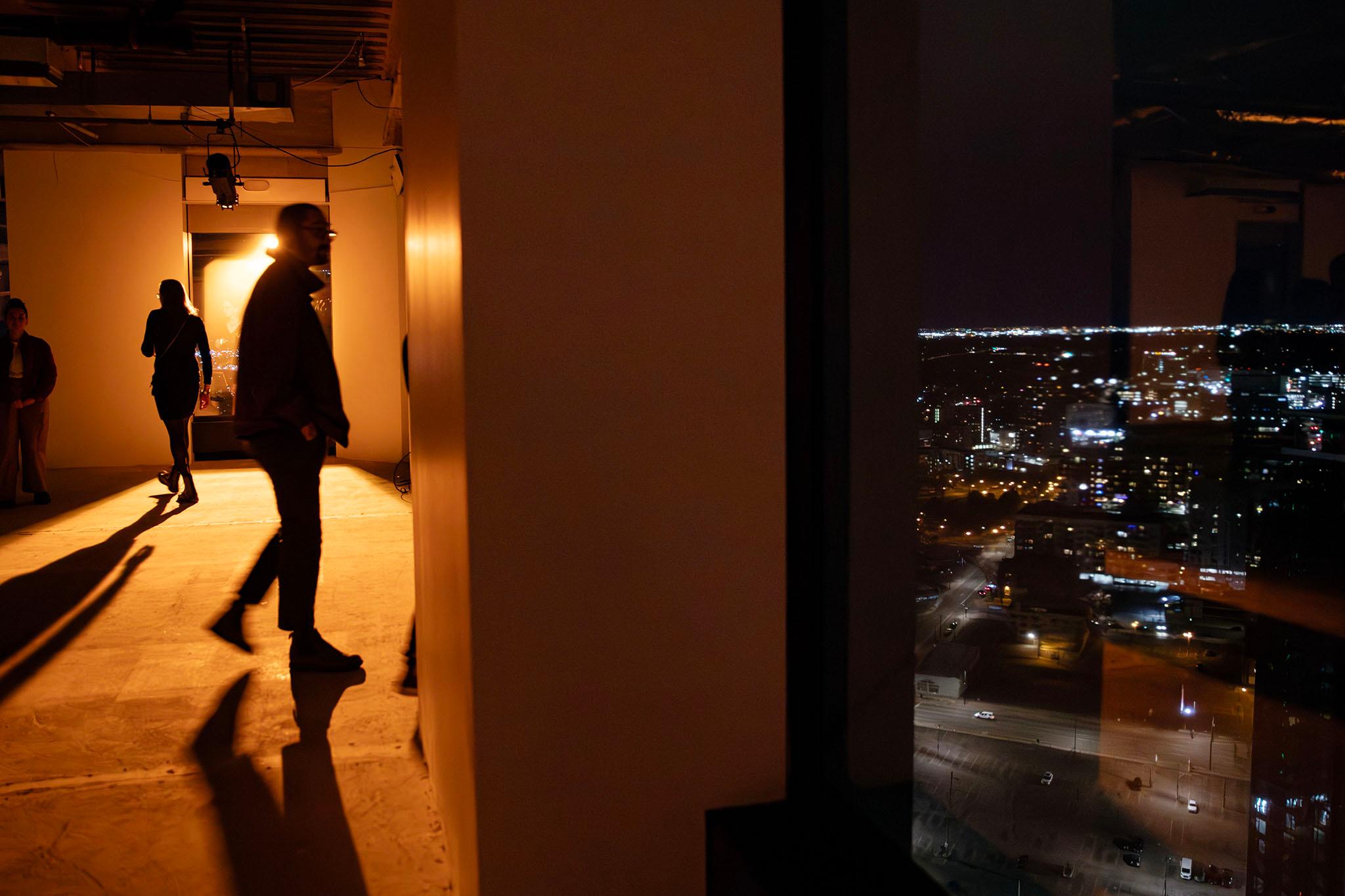 Two stories of gutted office space had been converted into a series of galleries dimly lit with colored lights. Solitary guests stood at windows, staring into adjacent office towers with floor after floor of illuminated emptiness.